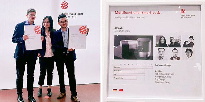 這次獲獎(jiǎng)的產(chǎn)品是中德合作的成果,這款智能門鎖由上品設(shè)計(jì),德國Aigang公司生產(chǎn),產(chǎn)品成功節(jié)省了在門鎖損壞的情況下的更換成本,只需更換鎖本身,不需要任何電子線路和門上的任何改變。非常適合于一些不允許做太多改變的古建筑,也適用于小酒店、小辦公室解決門禁問題。安裝過程也很簡單,不需要專業(yè)人士指導(dǎo)即可完成安裝,使用起來也同樣簡單易學(xué),鎖的長度也可調(diào)節(jié),可以為不同的門選擇鎖。
