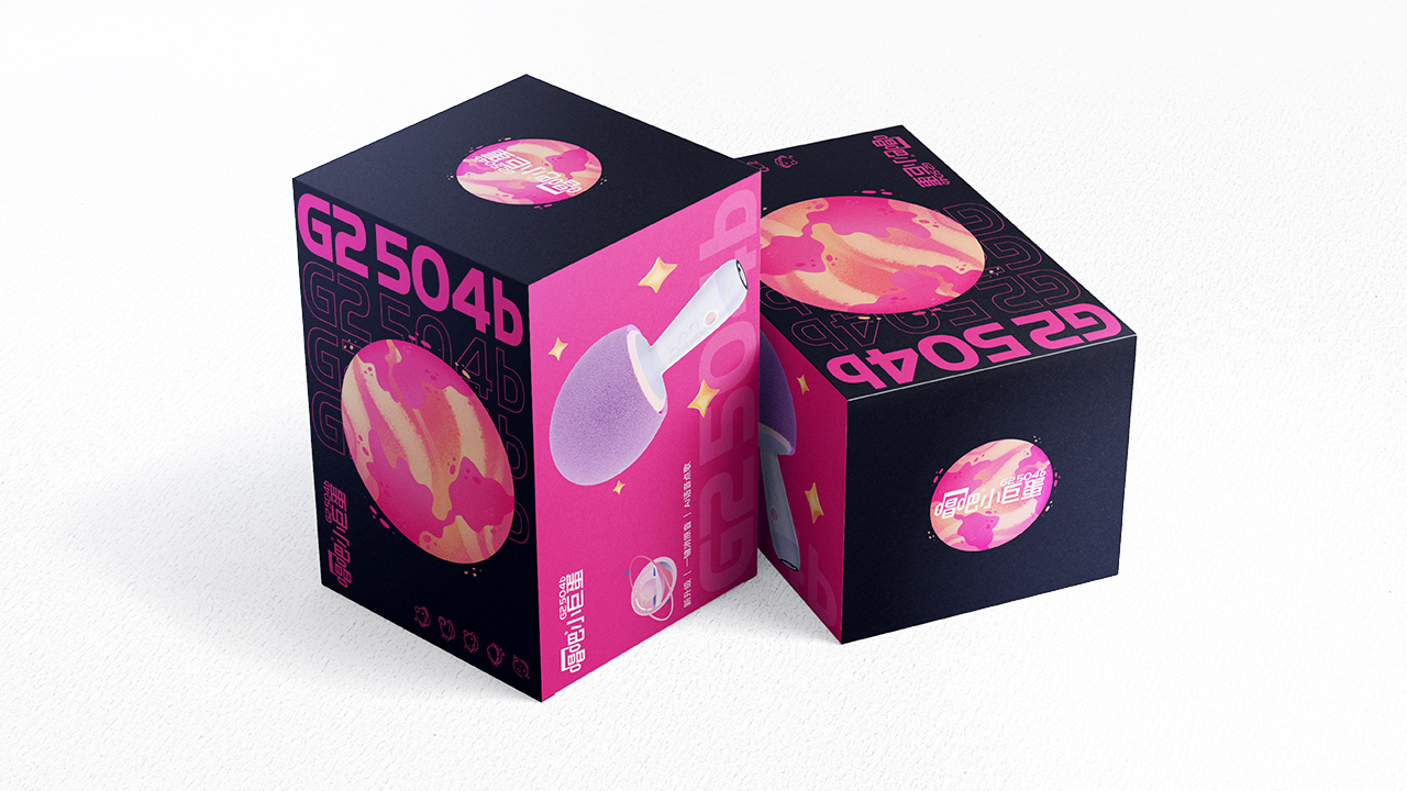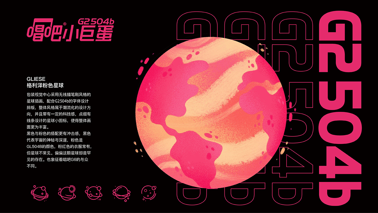 包裝視覺中心采用無線描筆刷風格的星球插畫,配合G2504b的字體設計排版,整體風格展于湖流化的設計方向,井且帶有一定的科技感,點綴有線條設計的星球小圈標,使得整體畫面更為豐富。黑色與粉色的搭配更有沖擊感,黑色代表宇宙的神秘與深遊,粉色是GL504B的顏色,粉紅色的衣服常有,但星球不常見。偏偏這顆星球卻是罕見的存在。也象征若唱吧G6的與眾不同。